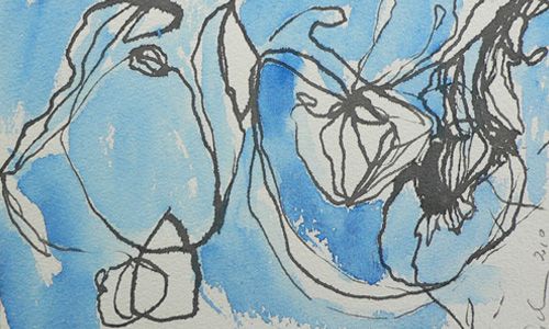 Betrachten wir die kleinformatigen Blätter dazu, 12 x 17 cm, auf Bütten mit Feder, Tusche und Aquarellfarbe, die diesen Titel tragen. Die Bilder stellen an mich die Frage, was ich denn da sehe. Ich sehe vor sommerlichem lichtblauen Himmel geschrumpelte Blätter, eingetrocknete Früchte auch; oder kleine Holzstückchen, vielleicht vom Olivenbaum, geschieferte Steine, oder… Aber ist es denn das, was ich zu sehen meine? Ich sehe gleichzeitig fast transparent erscheinende, hellblaue Flecken, die partiell von schwarzen, bewegten Linien eingefasst oder auch überschnitten werden. Ich spüre den taktilen Reiz des Bütten-Papiers. Ich nehme die Materialität des Bildes wahr und merke, dass diese Aufmerksamkeit drauf, Wie es gemacht ist, meine Gedanken nicht stört, eher beflügelt.