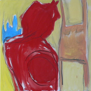 Schließlich will ich noch ein Bild zur besonderen Betrachtung empfehlen, es ist eine Selbstdarstellung: »ICH« (65 x 65 cm, 2012). Auf einem quadratischen Feld erkennen wir in einer intensiv-roten Fläche eine Figur, die in die Betrachtung eines Stuhls versunken scheint. Man könnte vielleicht sagen, es sei ein Paradigma der künstlerischen Haltung von Gunhild Tuschen: die gegenständliche Welt betrachten, und sie mit den ihr eigenen Mitteln, der spezifischen Materialität (Farbflächen, Linien) und Artifizialität darstellen: Voller Vitalität und Wärme, mit klarem, hellen Blick – über der großen roten Figurenform züngelt ein klares, helles Blau – mit einen solchen Blick