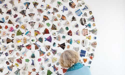 Aus weggeworfenem Papier, alten Zeitungen und Illustrierten, Bahn-Tickets und Schokoladenpapier gestaltet die Brüsseler Künstlerin Dett Peyskens Faltobjekte (in Form von Herrenhemd oder Kleid). Dabei ist das Motiv, das sie ins Zentrum ihrer Falt-Kunstwerke stellt, stets mit Bedacht gewählt. Die Liebe der Menschen zur Faltkunst ist eine sehr alte und geht zurück bis in die Antike. Dett Peyskens hat, ihrer eigenen Aussage zufolge, lange verschiedene Verfahren getestet, bis sie den richtigen Falt-Prozess fand. Mit einer speziell angefertigten Schablone wird der Ausschnitt begrenzt und markiert. Nach dem Ausschneiden wird das Falt-Objekt, stets nach gleicher Manier, präzise gefaltet. Für ein Kunstwerk wird dieser Prozess manchmal unzählige Male wiederholt. Die Faltobjekte können in verschiedenen Größen entstehen, meist jedoch in kleinerem Maßstab.